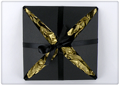 - Crumple a piece of tissue paper and fit it into the inside of the gift card holder. Feed the ribbon tails though the ribbon loops and tie a bow.