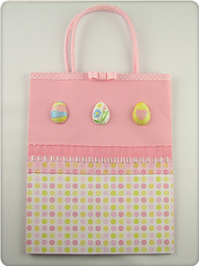 - Apply glue to the back of each of the egg ornaments and apply them to the front of the gift bag, centering them on the pink section of the bag.