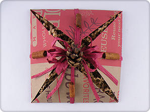 - Insert the gift into the the folded square and fill with shredded brown paper made from a plain brown paper bag.